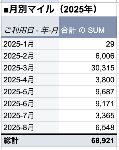 ANAマイルの獲得実績を8ヶ月分集計してみました。2025年1〜8月の8ヶ月間で約68,921マイルでした。