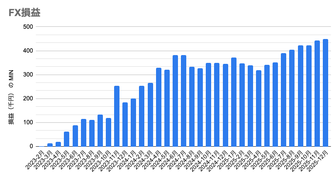 グラフにすると以下の通りです。無理せずという感じなので、その月の損益の最小値をグラフにしています。約3年間で見てみると基本的には右肩上がりです。