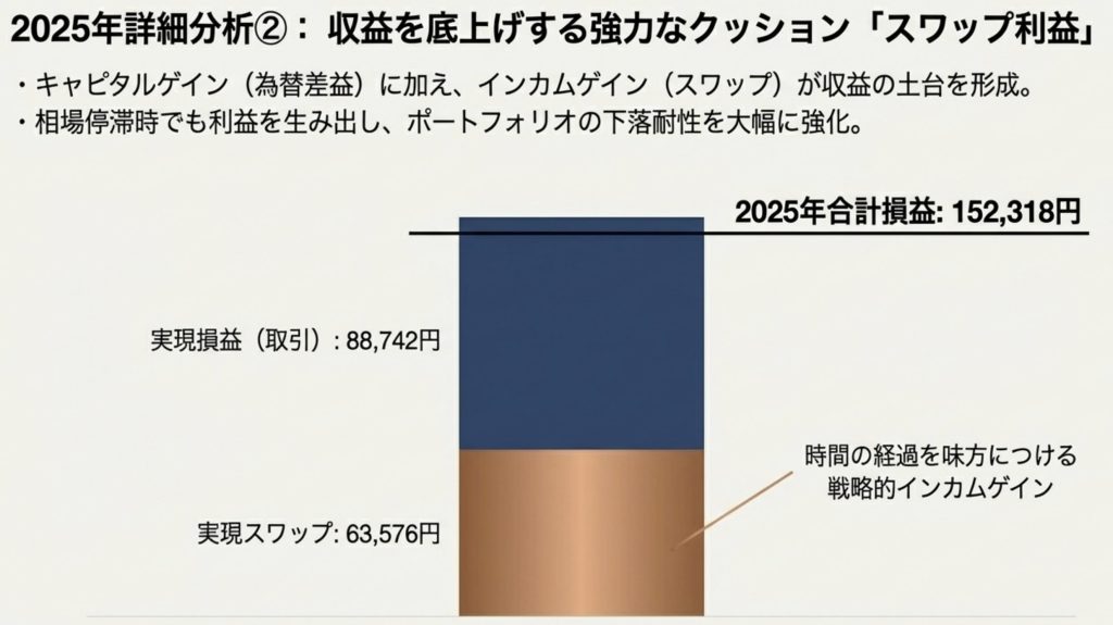 - 2025年の合計利益152,962円のうち、スワップによる利益が63,576円を占めており、為替差益だけでなくインカムゲインも重要な収益源となっています。